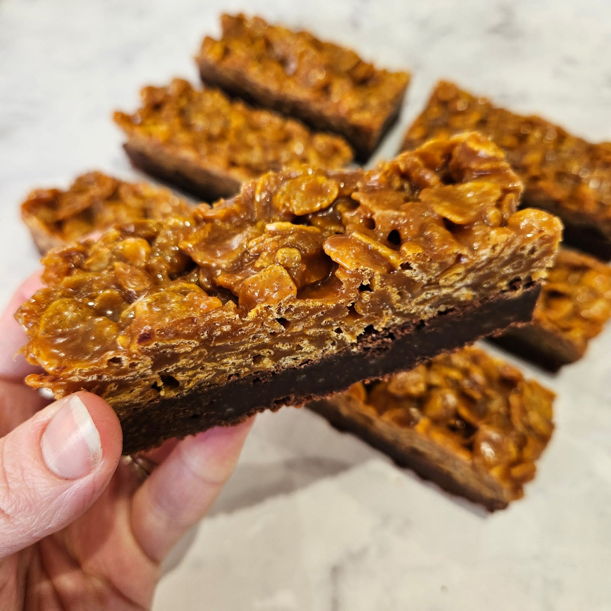 Classic brownie topped with cornflakes mixed with homemade caramel.